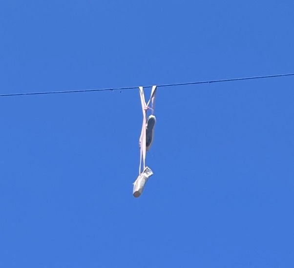 When I see sneakers strung over power lines, I think of a memorial. Someone lost. The association is both sinister and saddening, and still there is something beautiful in it to me. Such an ordinary item, transformed completely. Grief, on display in the sky.